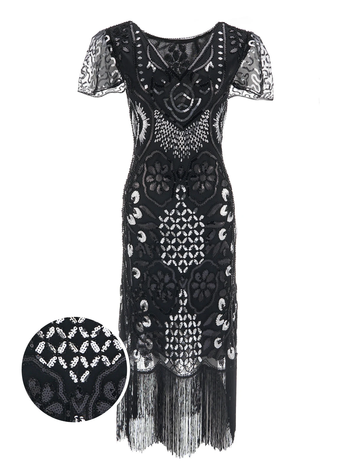 Let us know when you’ve popped your eyes back in! Thanks to swirling sequin patterns, it sparkles and shines all night long. Plus, the sultry v-neck and short sleeve make it even more alluring. Shimmer into an eye-catching vintage style with this iconic flapper dress from Retro Stage with crisp beading for a striking silhouette.