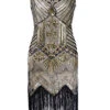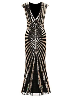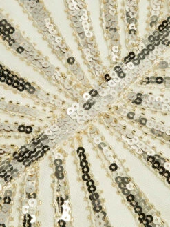 Your ticket to divinity, darlings! It’s all about the details with this stunning 1920s sequin Gatsby dress from Retro Stage. Thanks to swirling sequin patterns, it sparkles and shines all night long. Plus, the sultry boat neckline and little cute cape sleeve make it even more alluring. The glitzy Art Deco vibes and sultry silhouette will have you shimmying and swaying with confidence.Â