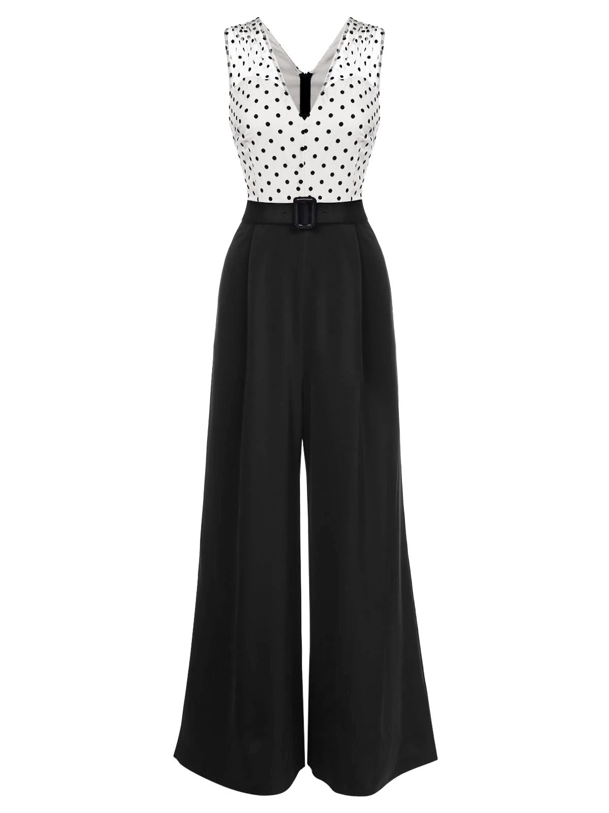 Giddy up, gals! This adorable jumpsuit is crafted in a marvelous black ice silk crepe fabric. The top has a black polka dot and is topped off with a V-neck collar. The seamed waist is cinched by a back zipper, as the wide legs drop to your ankles. Complete with a belt for all your retro needs!
