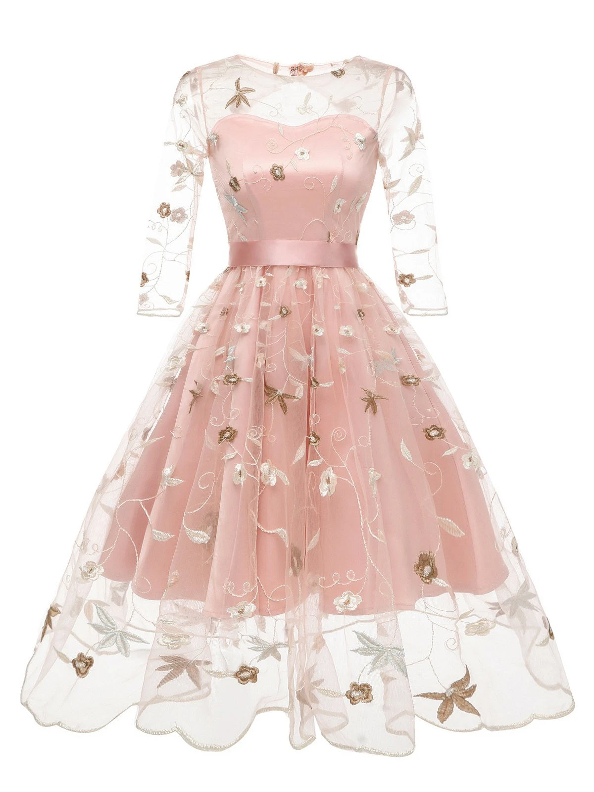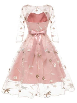 A sweet dress in fabulous 1950s vintage appeal fresh from Retro Stage. This beautiful mid-century styled dress is crafted in lace that twirls with floral embroidery divinity for the modern era through pink and apricot background. Outfitted with a back zipper, it’s a marvelous stunner!