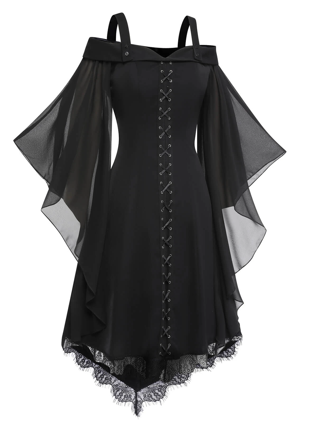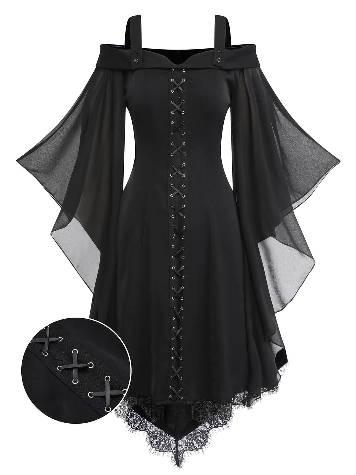 Feature:Â Front center decorative strap; Black mesh sleeves; Lace stitching hem