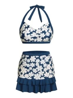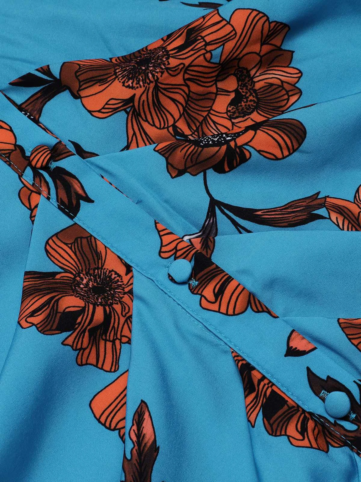 Blue 1940s Shirt Neck Floral Belted Dress