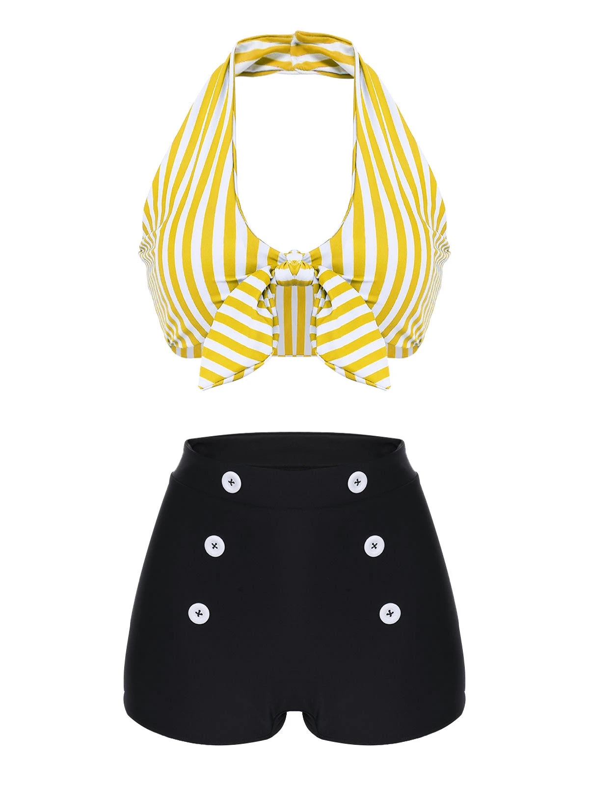Revamp your swimwear collection with the Green Retro Halter Stripes Bikini Set. Featuring bold green and white stripes, this bikini is your go-to for vintage-inspired style. The halter top ties at the neck and back for a perfect fit, accented with a playful front bow. High-waisted bottoms flatter your figure and provide comfortable coverage.