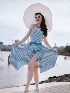 This Blue 1950s Stripes Bow Romper & Skirt will surely turn heads your way! A gorgeous vintage style romper & skirt full of feminine radiance, the gorgeous blue stripes are dancing with bowknots throughout the midcentury silhouette. A striking 1950s inspired romper & skirt that’s set to make a serious sartorial statement, where ever you choose to wear it.
