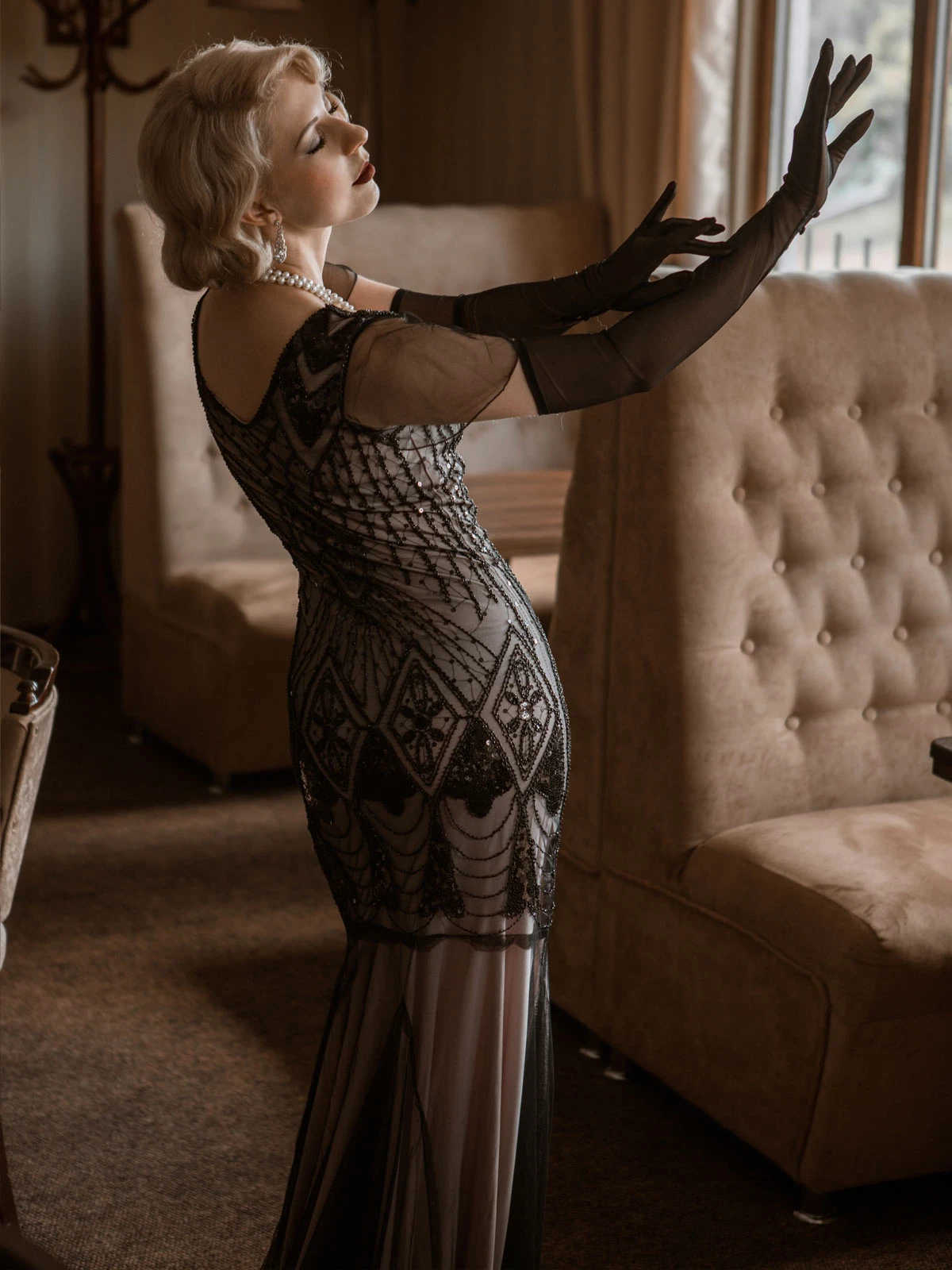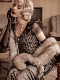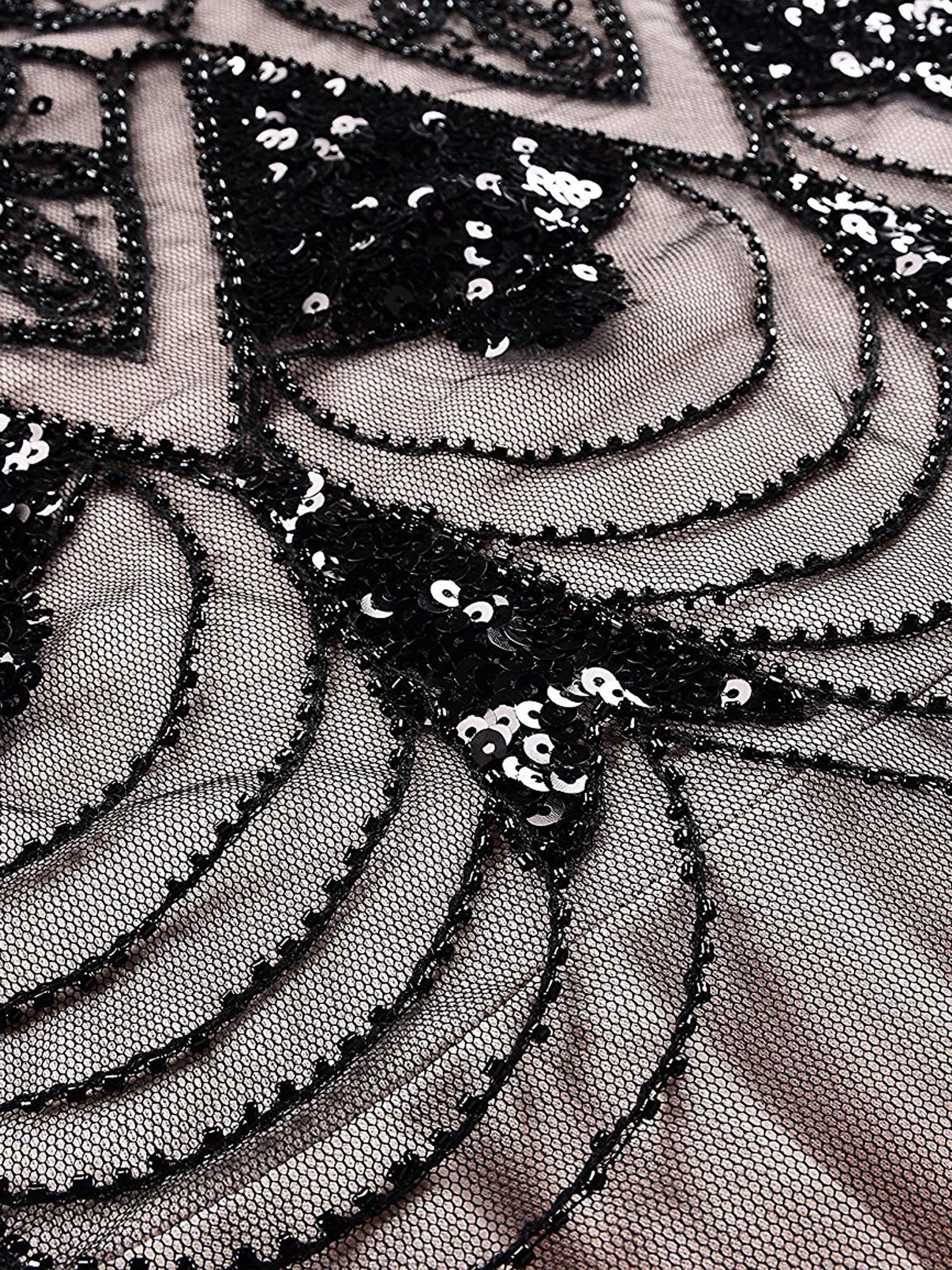 Feel like creating an atmosphere, darling? This stunning 1920s style frock from Retro Stage is a gorgeous deco affair in fabulous flapper design. The cap sleeves and V neck design shows you off with a modest touch. An elegant 1920s dress in a lightweight black mesh with a subtle pink lining that creates a sweetheart bodice.Â